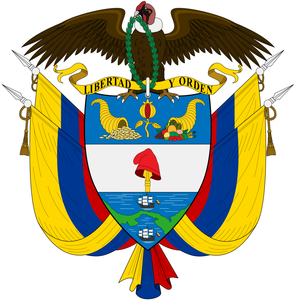 The national flag is draped on each side of the shield. The shield is broken into three portions. In the lowermost portion is a depiction of ships, pointing to the maritime history of Colombia, mainly to the Isthmus of Panama, which was part of Colombia until 1903. Nowadays represents the two oceans that border the country (Atlantic and Pacific). The sails mean the Colombian commerce with the rest of the world and the rising economy. In the middle section, over a field of silver (argent), the Phrygian cap is presented; this being a traditional symbol of liberty and freedom. The topmost section contains a pomegranate over a blue (azure) field, as a symbol of the Vice royalty of New Granada (early colonial name of Colombia back in the 18th century), in the middle flanked by two cornucopias or horns of plenty: the one at the right with golden and silver coins and the one at the left with tropical fruits. This portion represents the agricultural and mineral wealth of Colombian soil. (1)