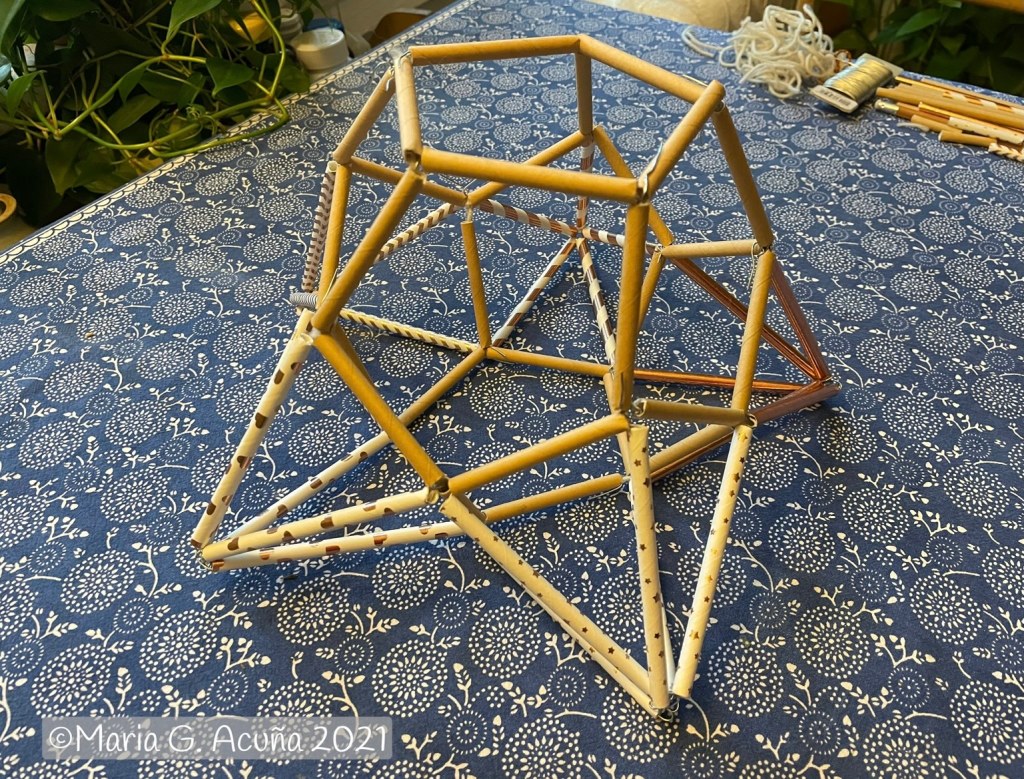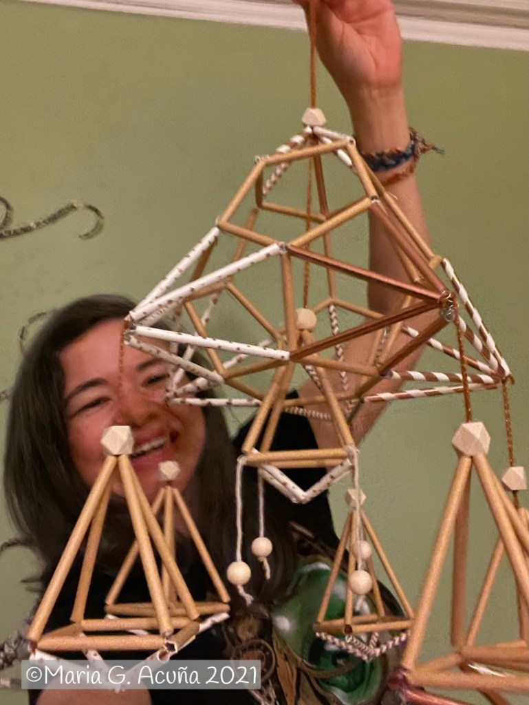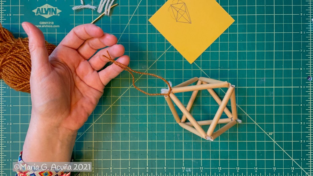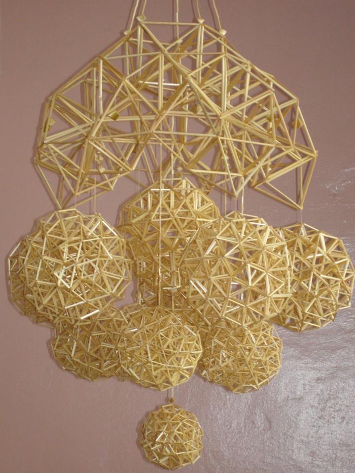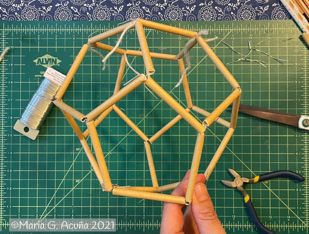 I decided to create one based of my favorite regular solid (or polyhedra) the dodecahedron (12 pentagons). My original intention was to create a star, but you will see what I ended up with! I used paper straws, string and wire to make them.
