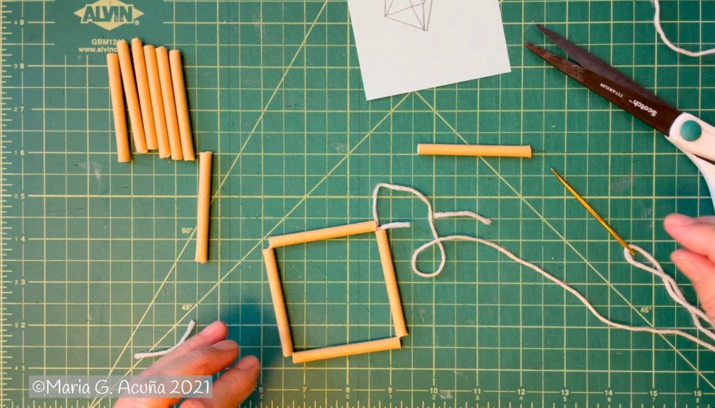 Figure out what design you’d like to make. Depending on your design measure the straws. For example to mame the most common Himmeli, an octahedron, you will need 9 straws of the same size.
