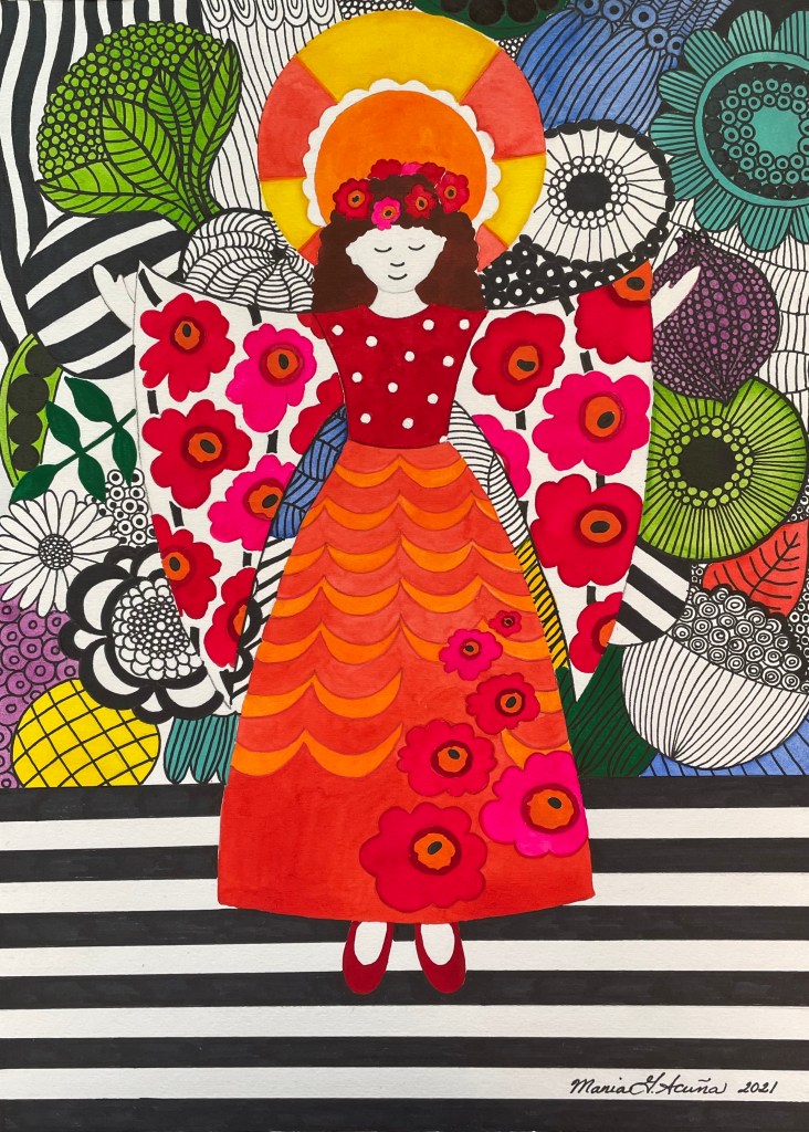 When it was time to choose an artist to study form this country, I looked at a lot of art and suddenly I saw a bold Marimekko Design. My mind immediately asked Why? Until now I thought this was a Japanese brand! (Because of its sounds…something about the M and the K) But when I realized it was Finnish, my choice was instantly made… I would create a Marimekko Angel! In my head I pictured this bold angel full of colors and patterns!