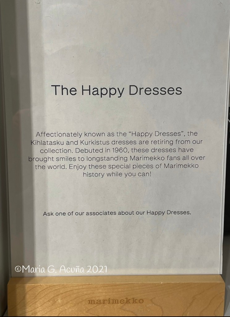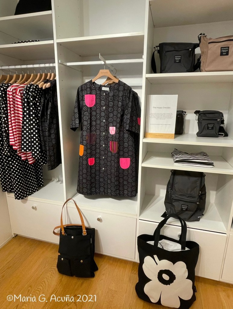 I met Emma a young sales woman dressed in a Marimekko green Unikko dress that shared my enthusiasm! She told me so many interesting facts, like this year is the 70th year of the brand and they have put in circulation some designs that were made by their most famous designers long ago. One of them was a tiger print by Maija Louekari. Loved a towel they had with that print. Oh! and I also absolutely fell in love with a dress, called the Happy dress: