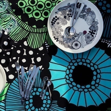 New products have been introduced in the home collection, such as the Sukat makkaralla (socks rolled down) glassware by Anu Penttinen, the Konkkaronkka (bunch) cutlery by Mari Isopahkala, and the Hehkuva (glowing) lantern and the Valoisa (bright) lamp by Harri Koskinen. Artists Astrid Sylwan, Paavo Halonen and Kustaa Saksi made their debut as Marimekko print designers in the early ’10s. (1)
