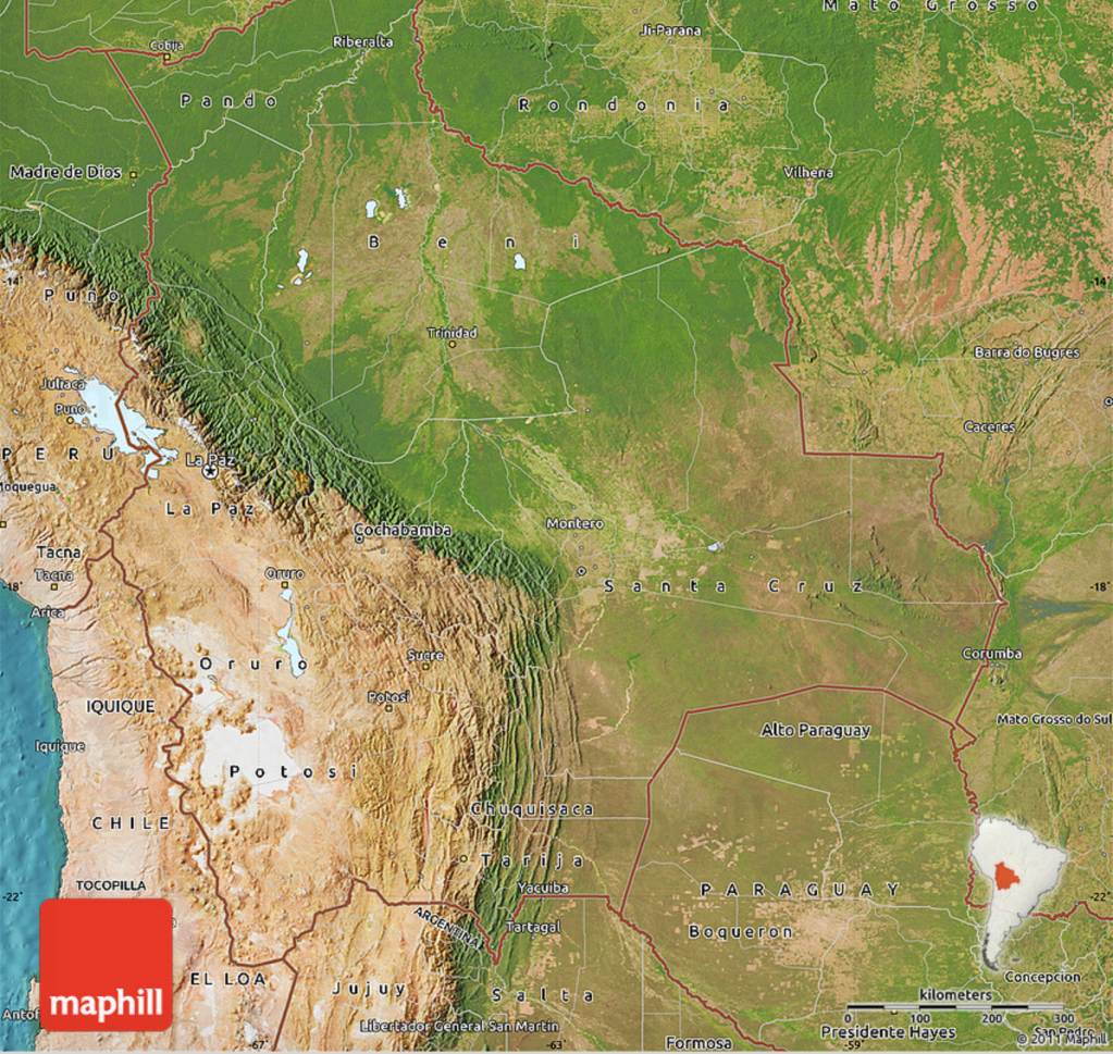 The following map shows the Bolivia and that thick brown area is the Andes: