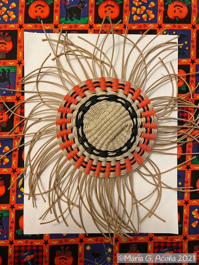 So beautiful! I really wanted to do something like that but it’s hard to find the materials… and even having the skill to follow a video like this one! So I looked up kits with instructions and I found a kit to weave a plate from the Native American Hopi Culture. I liked it but most importantly I thought I could do it! And I did… almost! I worked about 12 hours on it and this is my finalized version, not the one on the kit! I call it the Halloween Sun! ^ ^