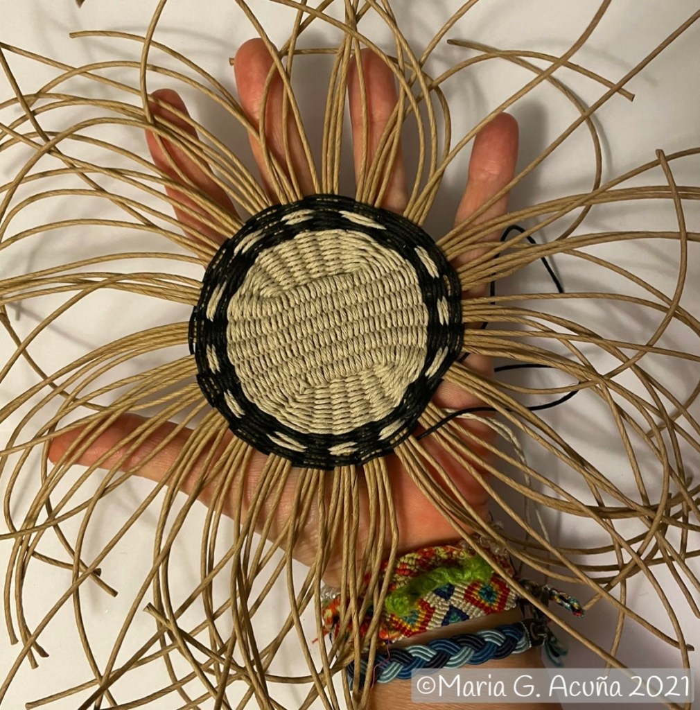 I used a cutting board to support all the ‘spokes’… spokes are the threads that sirve as the base for your weaving. In this kit is is a hard cardboard like material.