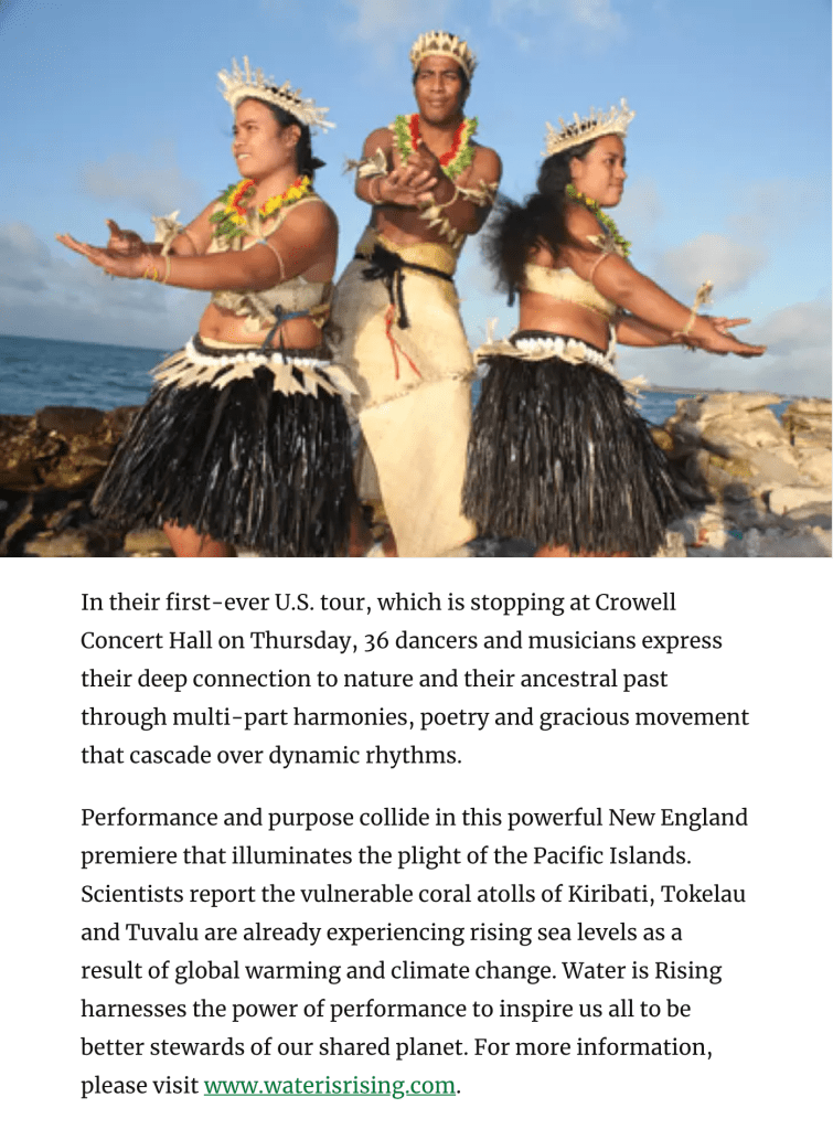I can’t help feeling sad as I write these posts about Kiribati. I found an article and it described how the Kiribati dancers were dancing right close to my home in Connecticut to raise awareness of how their homeland sinks day to day. You can see a bit of it below and find it whole HERE.