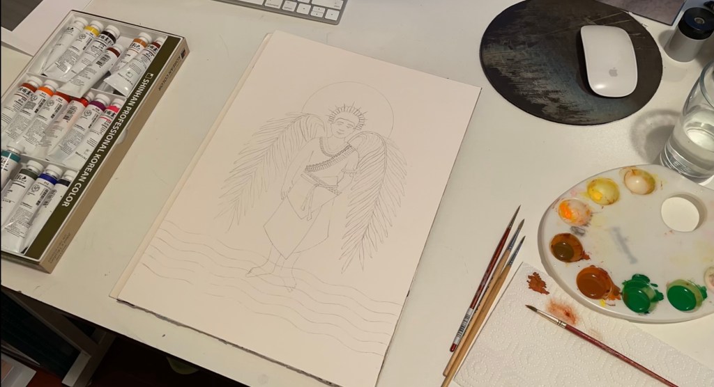 I decided on wings made of huge palm leaves too. It is such a great part of their culture. Then for the background I was inspired in their flag… I thought the contrast of the red and the palm leaves would be incredible. I also wanted to place him as if floating on water… Here is a bit of my process: