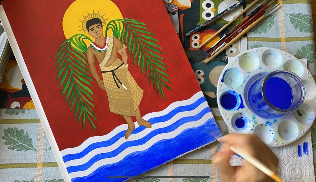 I tried finding a visual artist from Kiribati, but I was not able to. So I decided to create an angel that reflected some of the elements I learned about this beautiful country. I decided to use the image of a man I posted in the weaving post as the base for may angel. His eyes, the way he looks with them seemed very angelic to me… very kind and sweet: