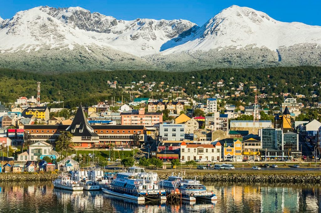 And way at the bottom, Tierra del Fuego, the island of Tierra del Fuego lies at the southern tip of South America. The Strait of Magellan separates it from the mainland. The island is divided between Argentina and Chile. Ushuaia, one of the southernmost towns in the world, is on Argentina’s part of the island.