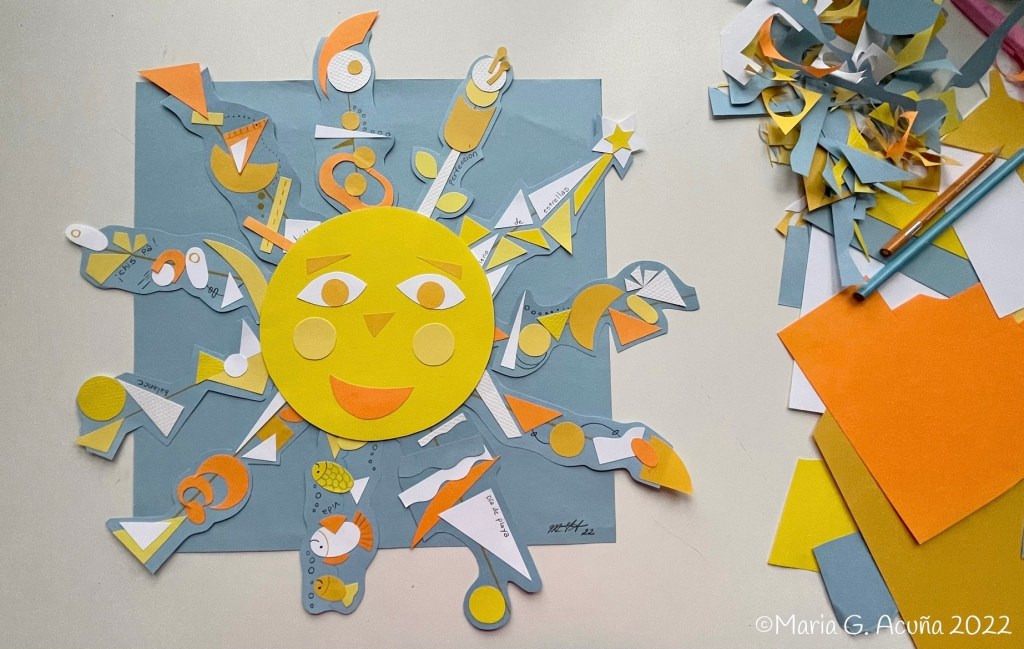 I also wished to give this project more depth from the artistic point of view and somehow relate it to Argentina. I remembered a project I liked in an art book I purchased recently*. The author, Susan Evenson was inspired by Kazimir Malevich, an Ukranian artist who was a pioneer in painting in an abstract way. Her project invited one to “Harmonize on a line”… by placing shapes in a balanced way along a line. I loved this idea! I could see potential in this becoming a ray of sunshine: