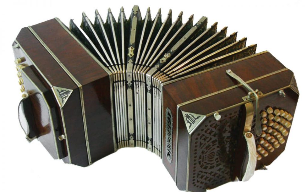 The bandoneon (or bandonion, Spanish: bandoneón) is a type of concertina particularly popular in Argentina and Uruguay. It is a typical instrument in most tango ensembles. It looks and sounds a lot like an accordion… but it has its very own particularities. In this poster you can see the different instruments that make up the accordion family: