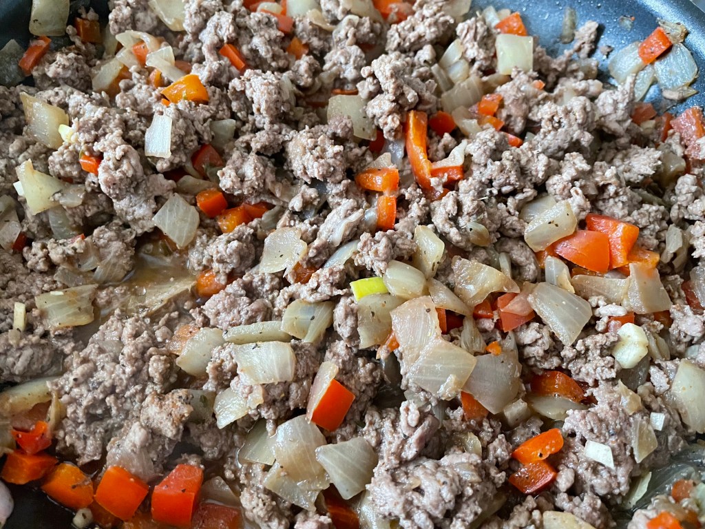 5. We added the meat, the paprika and the bay leaf and let it cook until all brown and nicely separated.