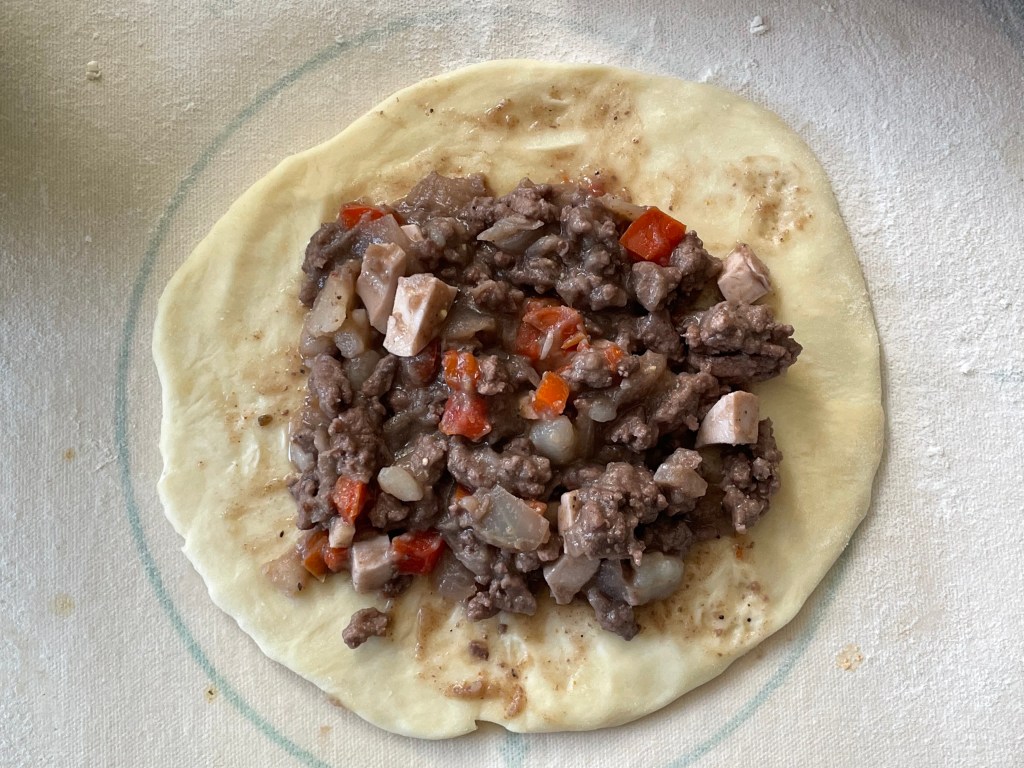 7. Then we made many circles with the dough. Ailin recommended the size of a ping pong ball. I was able to make 6. And you add the meat “guiso” in the center: