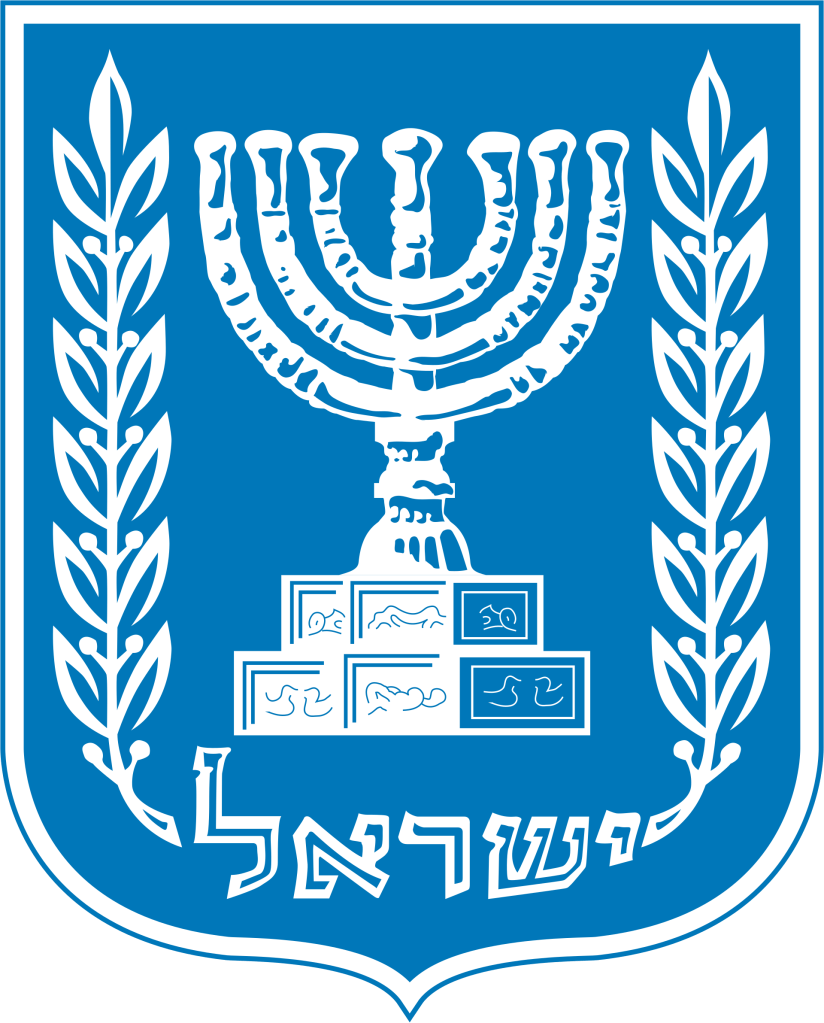 The Emblem of Israel (Hebrew: סמל מדינת ישראל), depicts a temple menorah surrounded by an olive branch on each side, with the word “Israel” written in Hebrew (ישראל) below it.