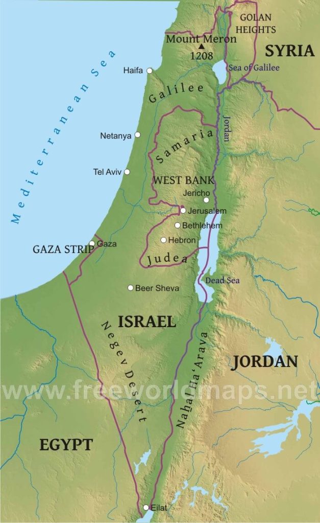 Even though Israel has a small land area 290 miles (470 km) north-to-south and 85 miles (135 km) east-to-west at its widest point, it has four defined geographic regions: the hill regions of northern and central Israel, the Mediterranean coastal plain, the Great Rift Valley, and the Negev desert. (2)