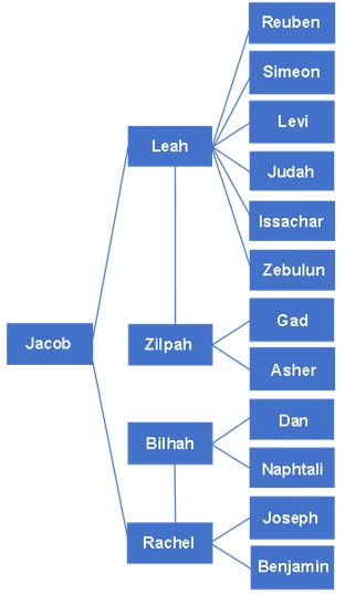 Jacob married two women and had two concubines and his sons and grandsons created the 12 tribes of Israel. Here is a graphic with his wives, concubines and sons.