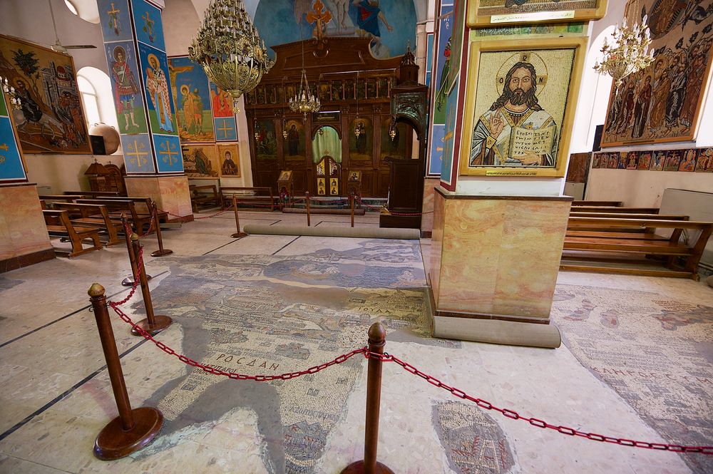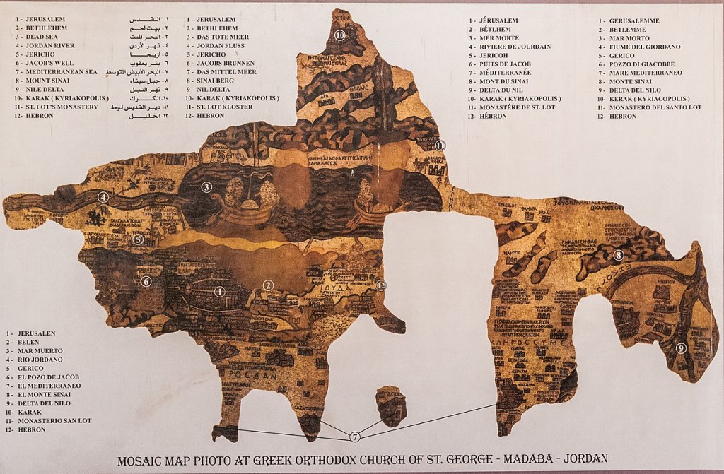 This is the Madaba Mosaic Map. It is part of a floor mosaic in the early Byzantine church of Saint George in Madaba, Jordan. It contains the oldest surviving original cartographic depiction of the Holy Land and especially Jerusalem. It dates to the sixth century CE. According to some accounts it is very accurate.