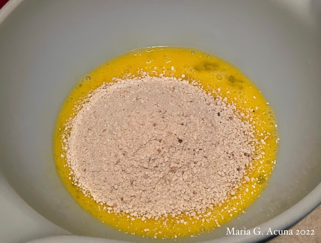 Place the matzah meal on a bowl and add the 2 eggs and oil.