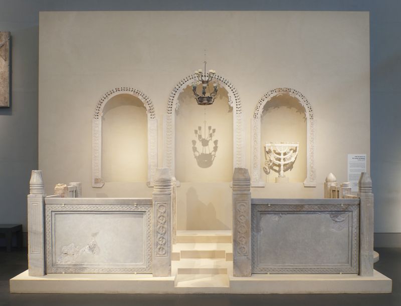 The Holy Land Gallery houses remains from the Byzantine Period 324 – 638 CE to the Early Muslim Period 638 – 750 CE. It includes items from churches and synagogues, their lamps, chandeliers, and other ritual objects, their mosaics and inscriptions, reveal the uniqueness of each religion and its set of beliefs – while pointing out the similarities in their material culture. Their resemblance is best illustrated in the reconstructions – of a synagogue and of a church bema – on display in the gallery, where the architectural design of their places of worship shows a common origin.