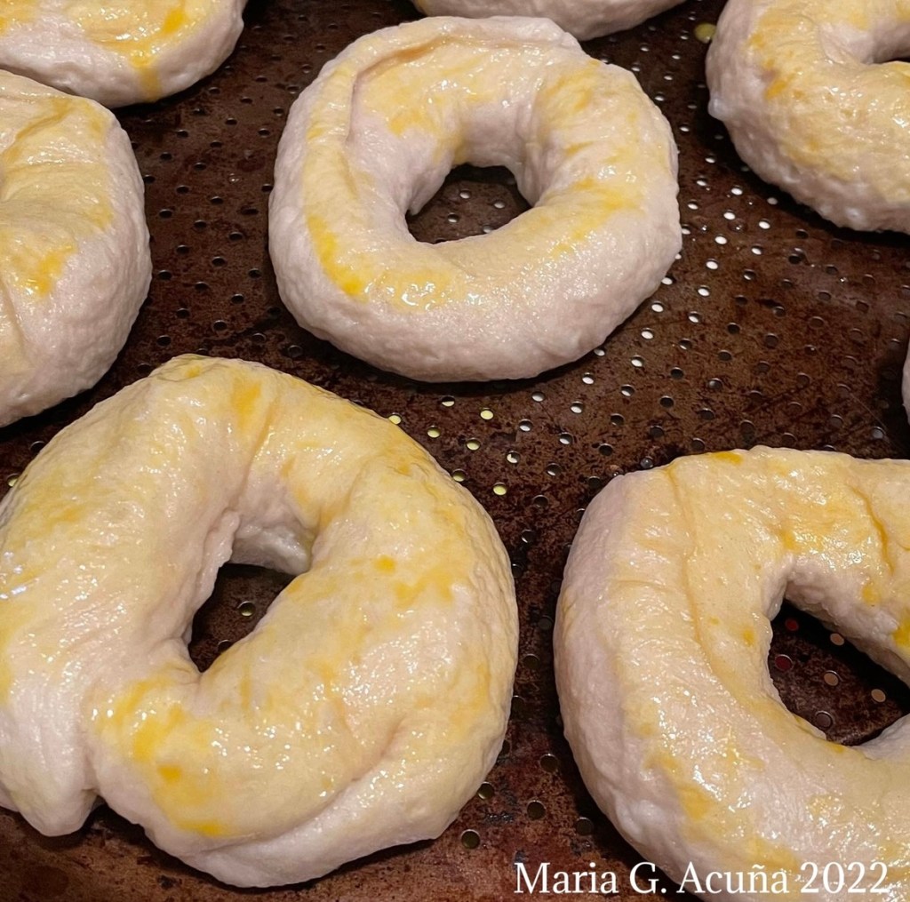 8. Spread egg yolk on the top side of each bagel for a golden color!