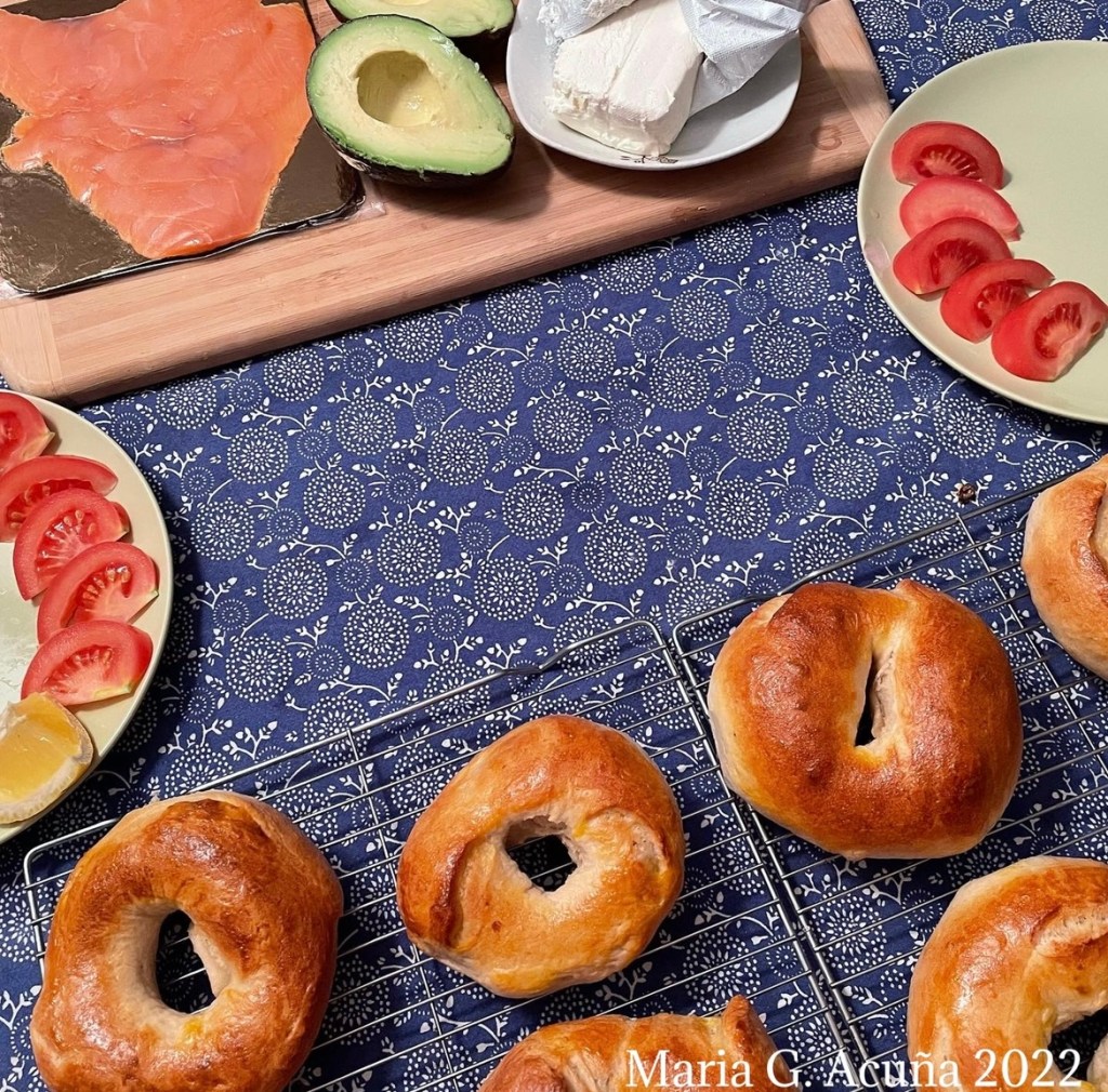 Now what does one usually eat with bagels? Cream cheese!!! But aside from cream cheese there is a very typical way in which Jewish people from New York eat their bagels. They eat them with what they call “lox and schmear.” Meaning a fillet of brined salmon which may or may not be smoked. The schmear is the cream cheese. This is decorated with onions, tomatoes and capers.