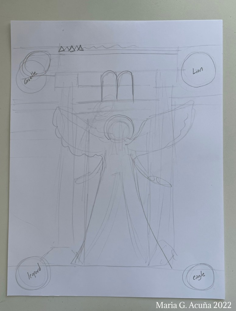 So… I liked the idea of working on parchment paper, but in the end I decide on a non animal like material called ‘Dura-lar’ a very sturdy polyester film material. For my theme I used the First Jewish Temple: The Temple of Solomon, as the background. This temple was so beautiful!