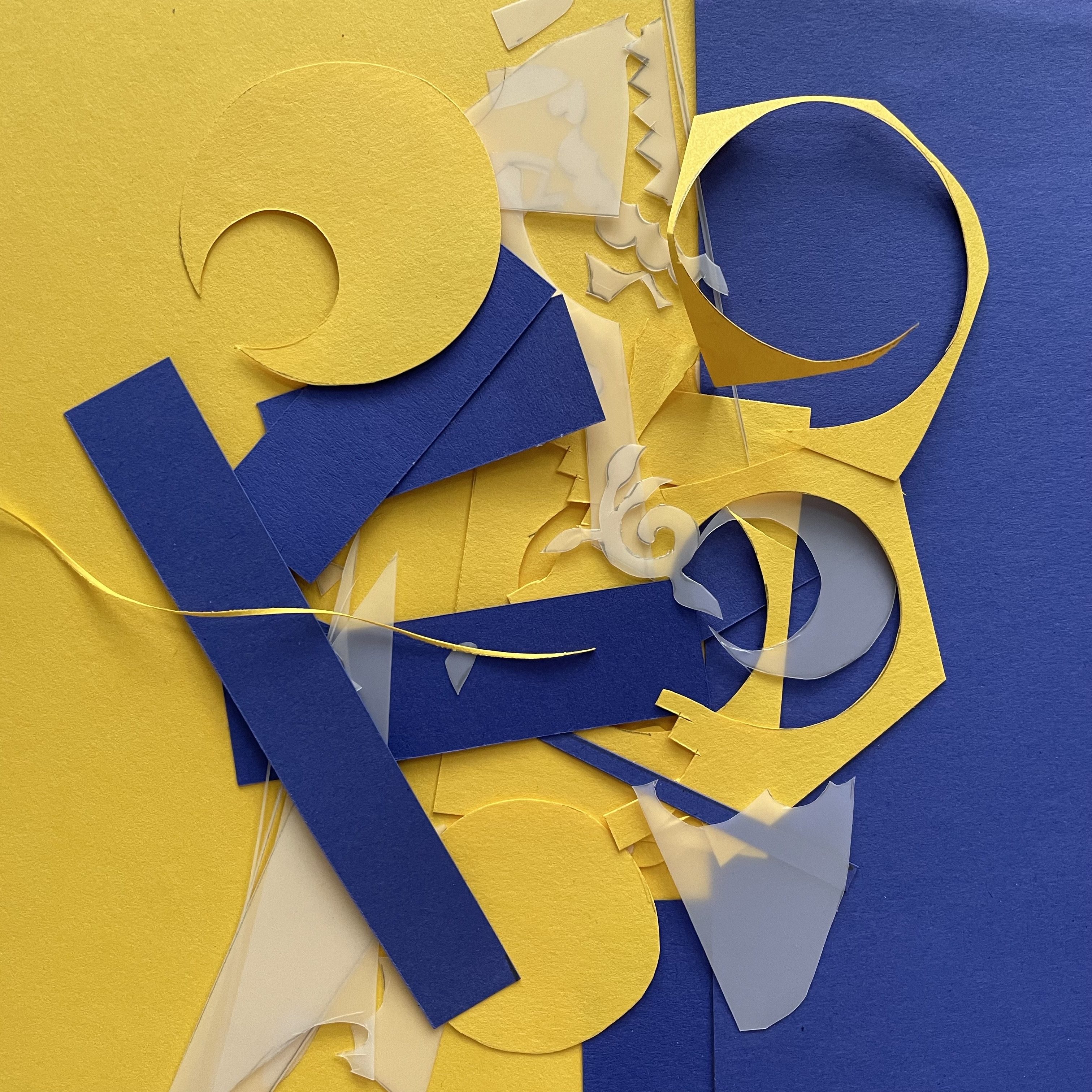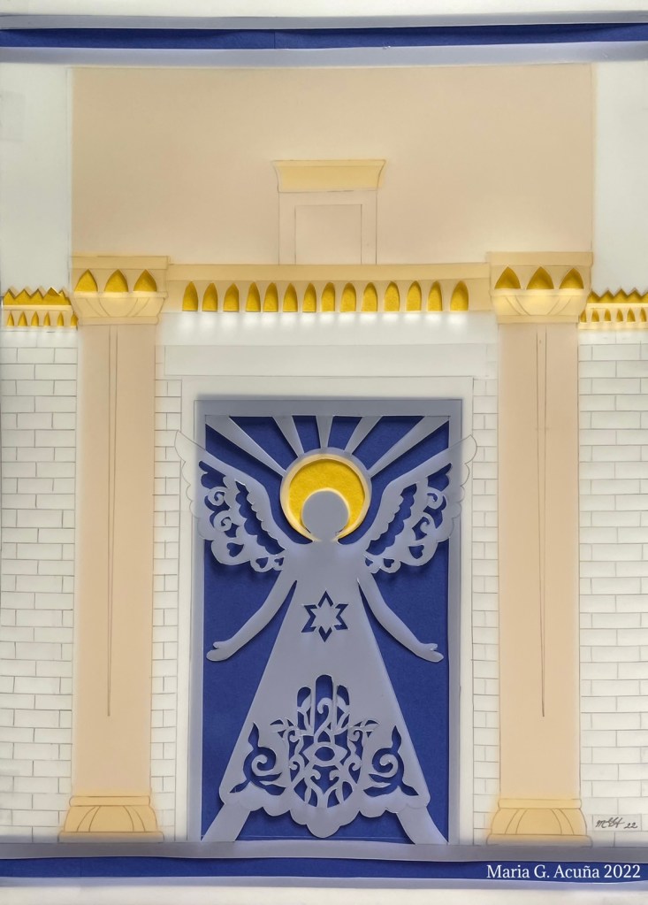 I decided to place the angel at the door, and I really loved the blue color behind it. I decided to add two blue stripes on opposite ends of the piece, making it look like the praying shawls religious Jews wear (tallit) and the two stripes on their flag.