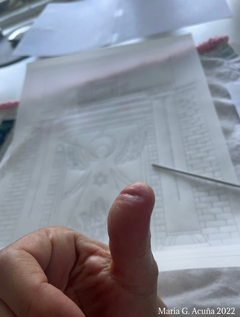 Then came the most painful part. I knew by experience that if you push hard on parchment paper you get a nice 3D relief feel. Well with the plastic version you don’t get it as strong, you don’t get the white line, but I still liked it. So I laid the paper on a kitche towel and using a crochet needle I re-drew the entire image. It was hard… my thumb and finger tips were in absolute agony.