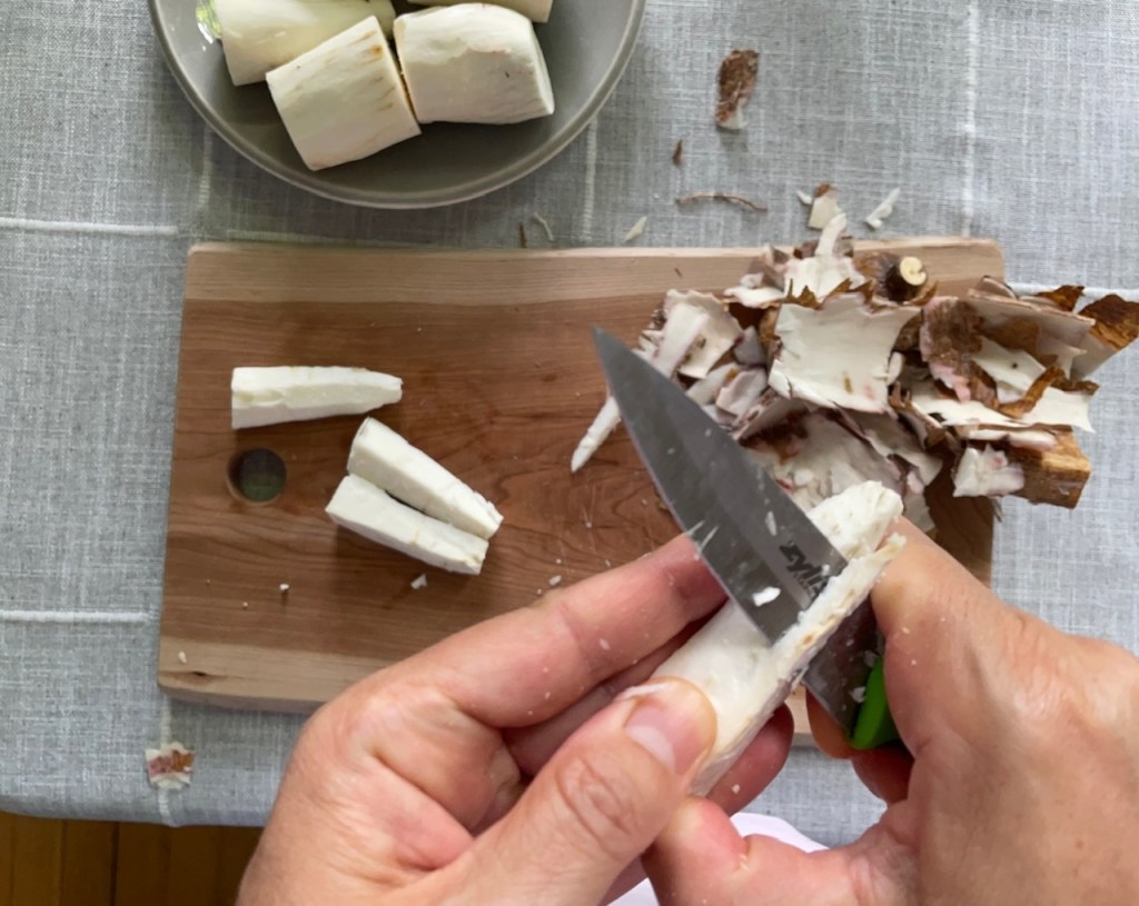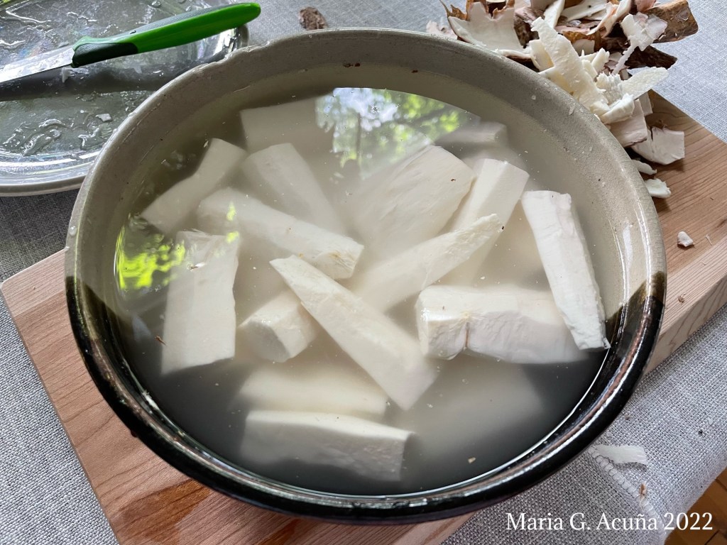 I found a recipe that did not require me to dry and pound the cassava into a flour. This is how I made ‘my’ Fufu. I followed the recipe from Precious Meshi Nkeih (née Nchifor) born in Cameroon, living in the US. She says it is a water fufu made from scratch: