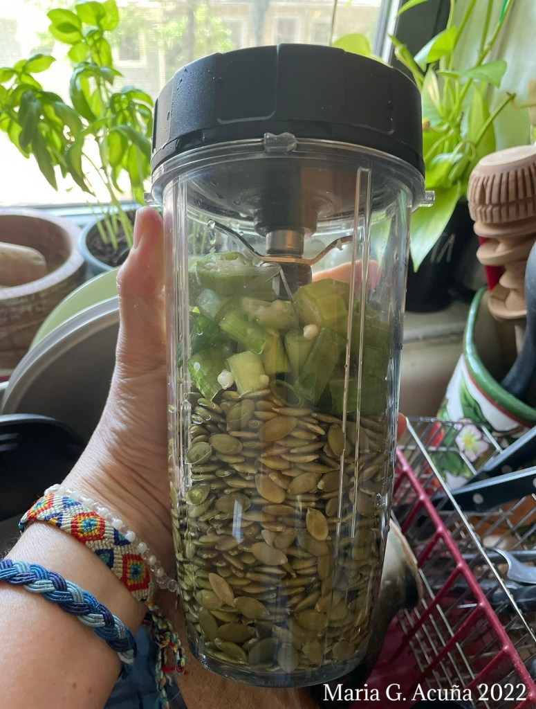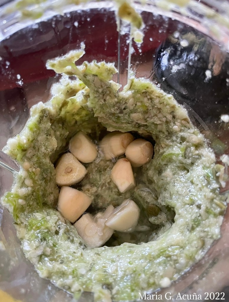 3. Place them with the pumpkin seeds in a food processor or blender. ( I added the garlic at the end.)