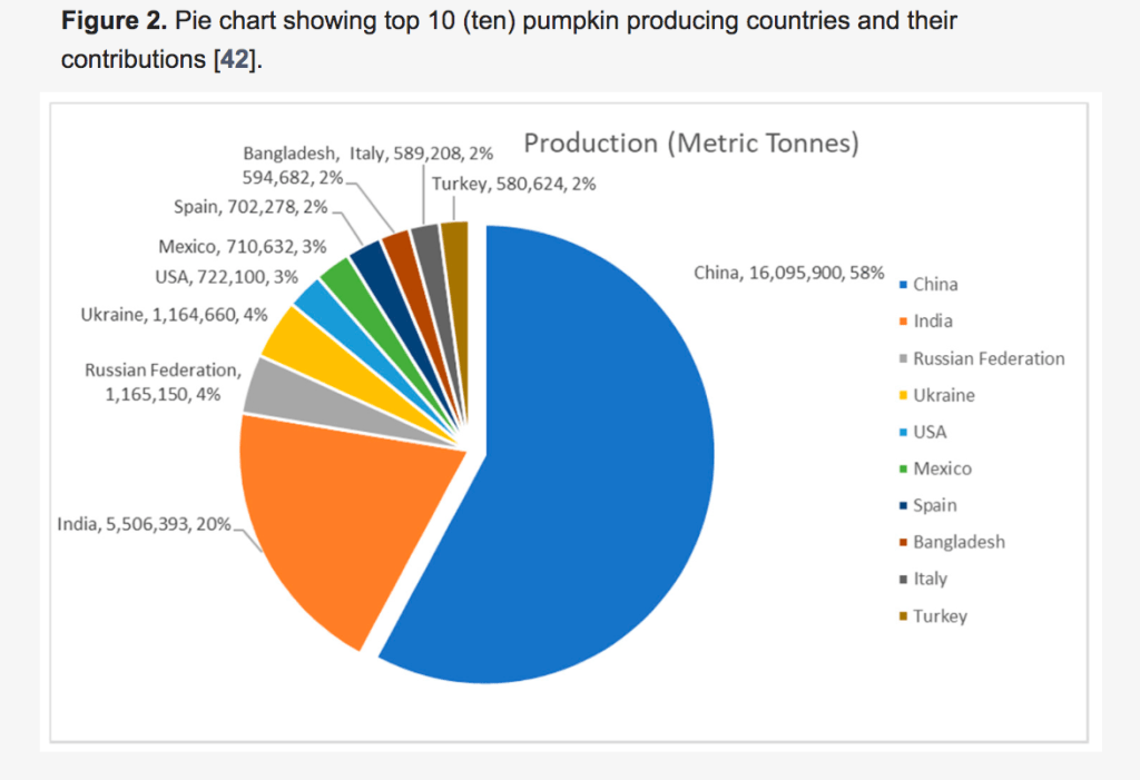 A was curious to see where pumpkins were grown the most… I thought it was here because of Halloween but to my surprise it was China! This is a graph from a 2021 research paper called “Pumpkin (Cucurbita spp.): A Crop to Mitigate Food and Nutritional Challenges” from Malaysia. You can find the whole paper HERE. (You will probably need to sign up to get access to see it for free.)