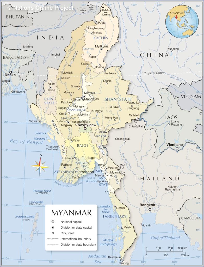 When I researched I found different approaches to the contrasting geography of Myanmar I decided to follow the regions as described in the book “Cultures of the World: Myanmar” by Cavendish Square publishers this year in its fourth edition. These regions are The Mountainous Northern and Western Regions, The Valleys and Plains of the Central Region, The Delta Region, the Shan Plateau, the The Long Tail and the Myeik Islands.