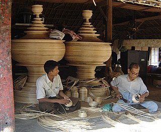 Pronounced as “Payun”. This is the art of making lacquerware. Artisans make boxes, vases, bowls, drinking cups, etc. with bamboo, teak wood or weaved horse hair. Then they are covered in a thick, black varnish known as “sis-se” that comes from the sap of trees. Images are carved once it has been dried and polished. Then colored in. It is a lot of work as to get multiple colors you must protect each layer and then carve again for the next color.