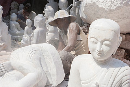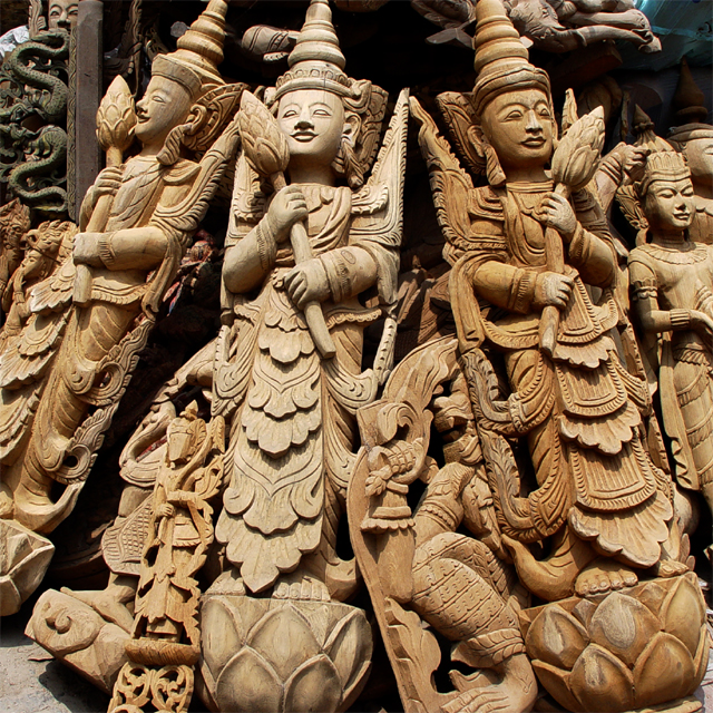 Pronounced as “ Bapu”. Sculptures in Myanmar has been made traditionally out of wood and stone. The art developed greatly during the Bagan Era. Buddhas, flowers, plants and humans are the main motifs, in many in religious buildings, pagodas, monasteries and houses.
