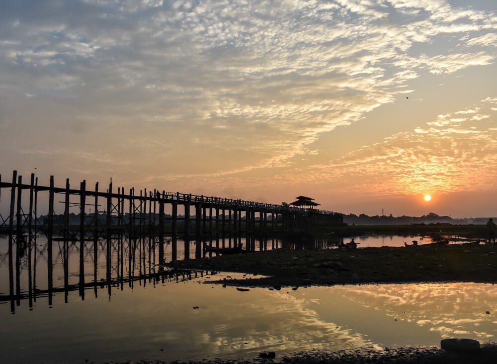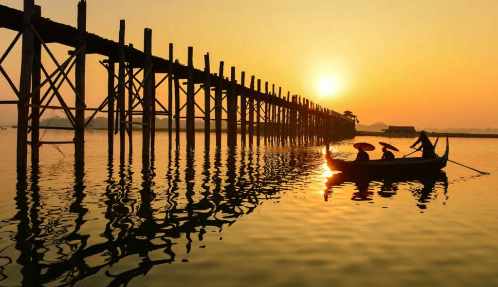 U Bein Bridge is a crossing that spans the Taungthaman Lake near Amarapura in Myanmar. The 1.2-kilometre bridge was built around 1850 and is believed to be the oldest and longest teakwood bridge in the world. Construction began when the capital of Ava Kingdom moved to Amarapura, and the bridge is named after Maung Bein who had it built. It is used as an important passageway for the local people and has also become a tourist attraction and therefore a significant source of income for souvenir sellers.