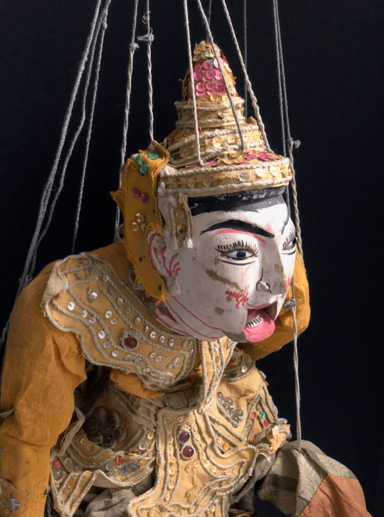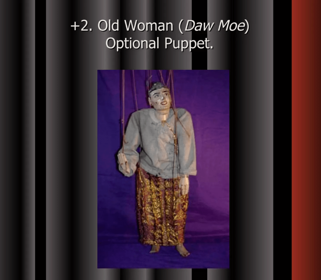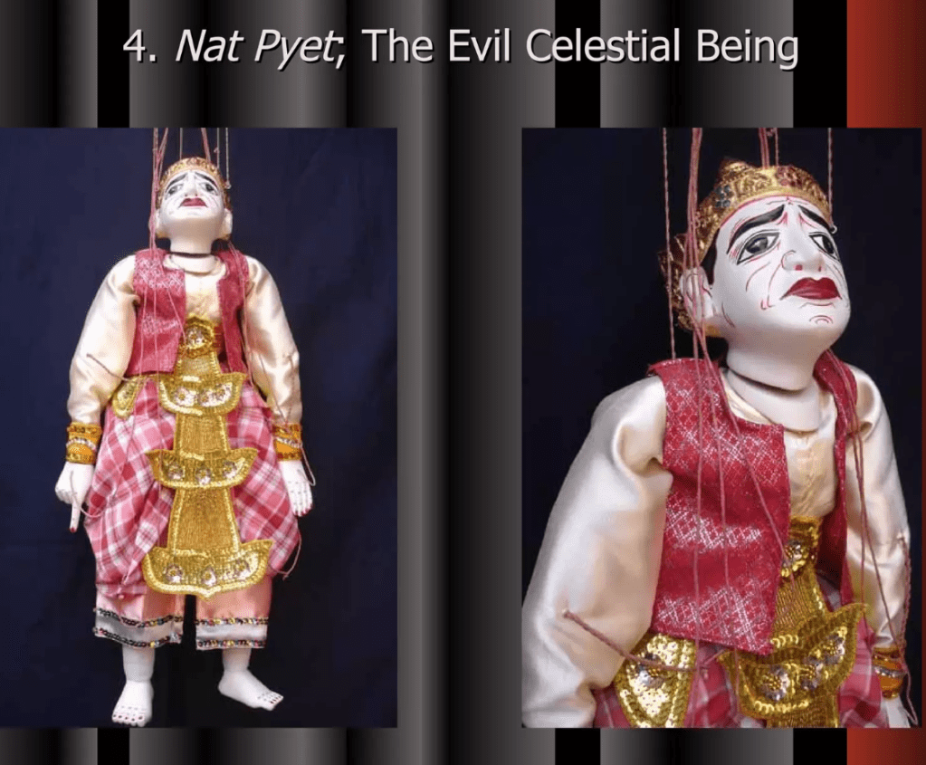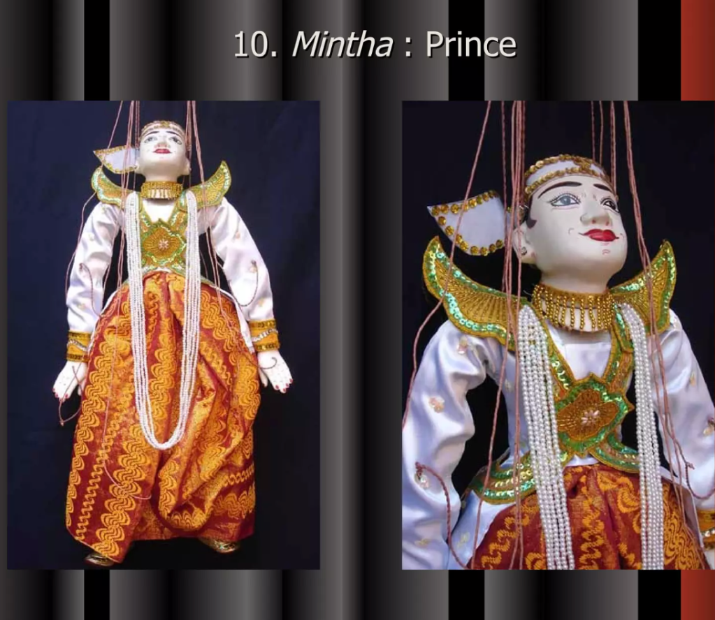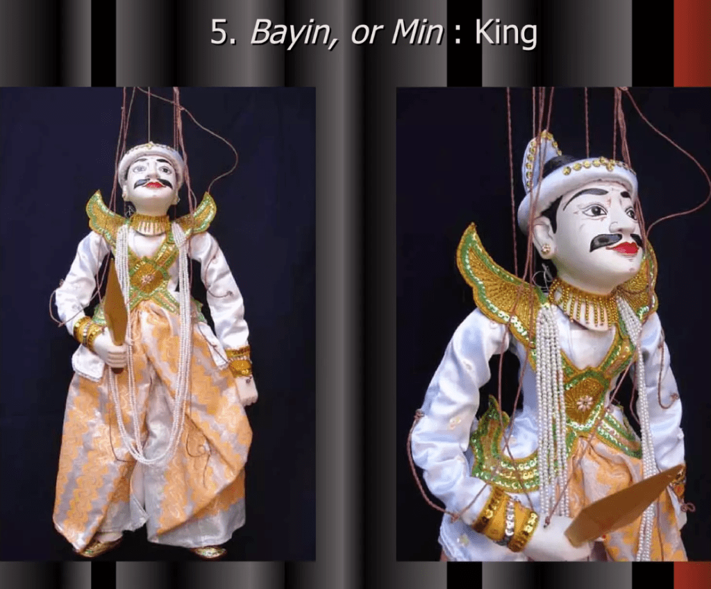 Even though Myanmar’s Traditional Marionette Puppetry has been influenced by India and Thailand greatly it has many characteristics that make it their own. One are the sort of cannon of characters that perform and the complexity in the creation of these marionettes.