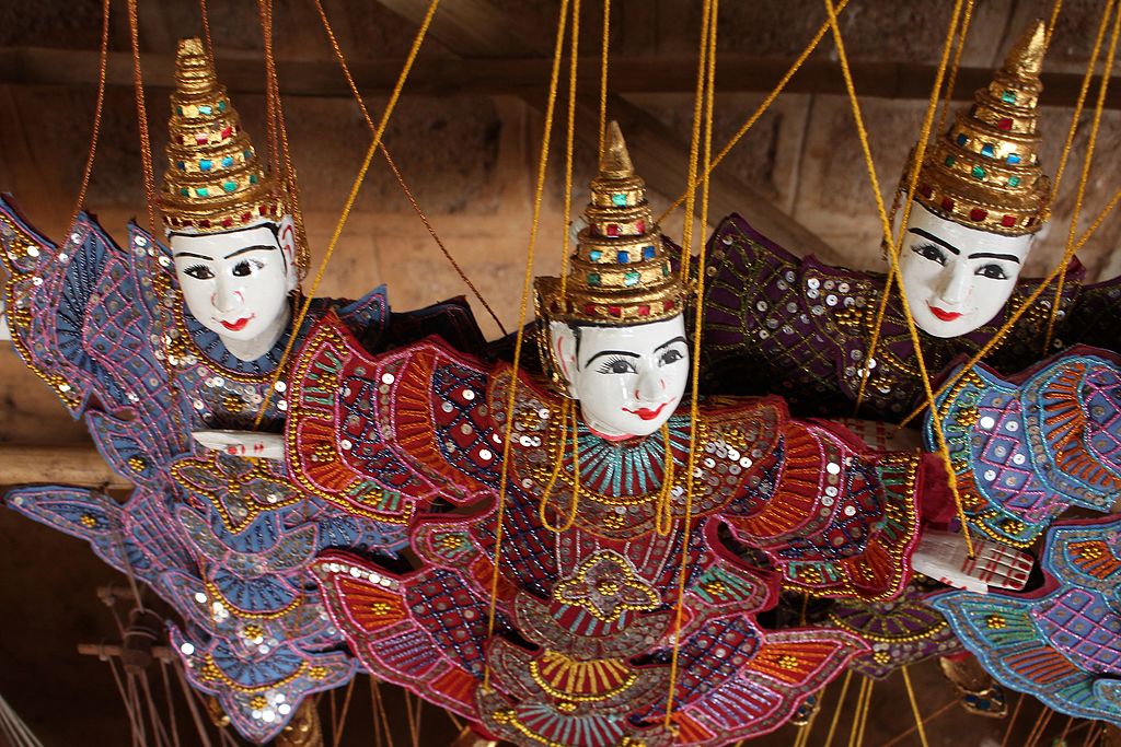 Marionettes are one of what are considered the four dramatic arts of Myanmar. These are: Singing, the Art of Instrumental Music, Orthodox Theater Performance (with human performers) and the Performance on the High Level. In Myanmar this art form is known as ‘Yoke thé.’ It literally means miniatures.