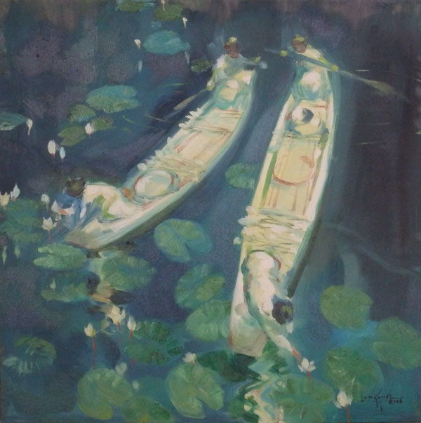 Lun Gywe began painting in a realistic and naturalistic vein, influenced by the major painters of the Rangoon School, Ba Nyan, Ngwe Gaing, San Win, and Thein Han who was his painting master. Over time, his works became more impressionistic and some of the works today might be called expressionistic. His exposure to rapidly executed Chinese ink and watercolor painting during his trip to China seems to have influenced his impressionistic work as he paints quickly and he is extremely prolific. Of his Impressionist style, he has said, “I paint according to my emotions, drawing inspiration from smell and textures, light and shadow” An important part of his work focuses on the female form, his favorite subject. A strong believer in Buddhism, his work is unified by his devotion to the principles embodied in that religion of order, harmony, stability and grace. He has said “I find inspiration in calmness. I cannot create a good painting when in an unsettled frame of mind. I often meditate before I start a painting.” (1)