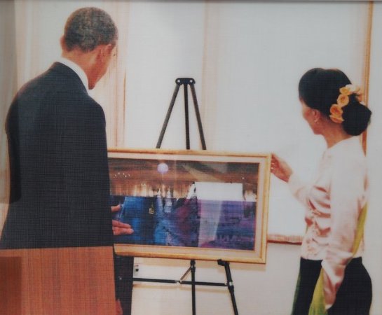 And here is Obama receiving one of his watercolors as a gift from the Myanmar’s Prime Minister back then.