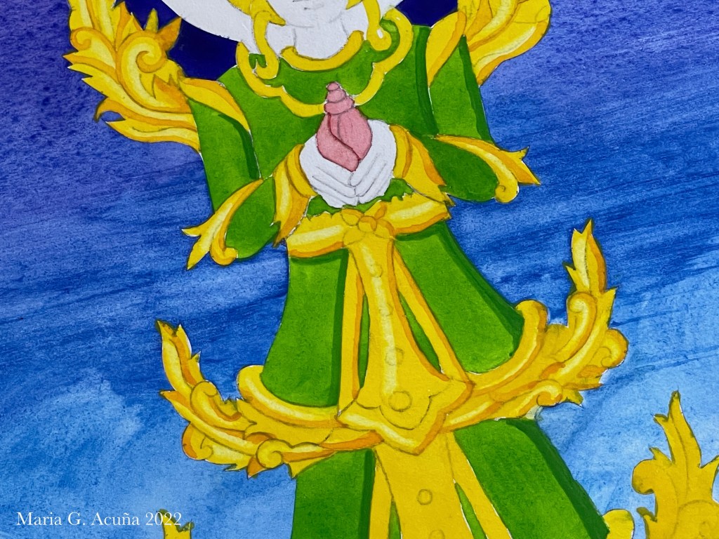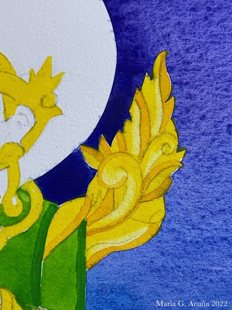 I thought to myself…What have I done? In Charlie Brown fashion: I ruined it!!! It was too dark. It took away its peace! By the way, I used a coating of Matte Medium Acrylic paint to protect the angel. It basically creates a plastic transparent layer over it so the blue watercolor paint does not mix with the yellow or green watercolor below. But… I forgot the lotus flower! So notice how one looses the color there.
