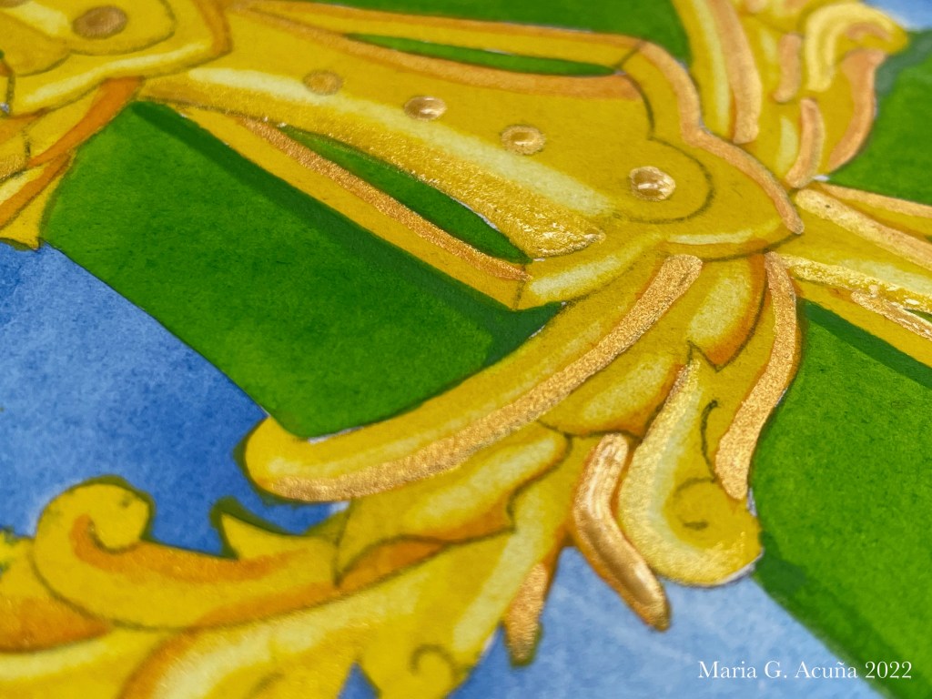 I applied the basic colors… then worked removing the paint and adding a darker color to give volume. You can see the difference in the highest wings (when comparing to the flatness of the rest of the yellow further down.)