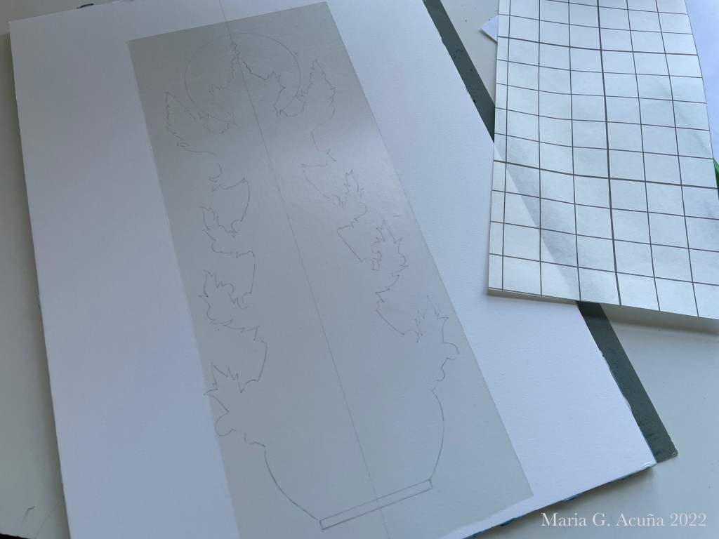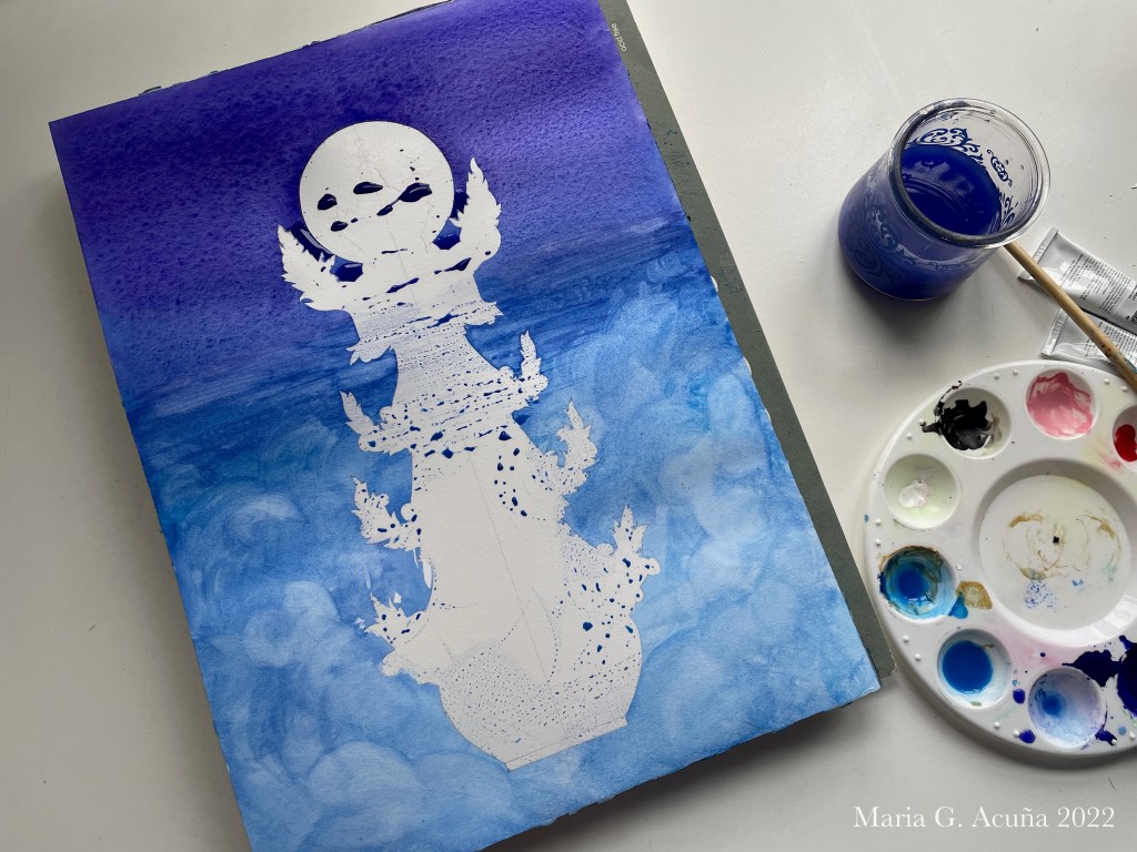 Then I gave more graphite to its outline, as I needed to cover it to paint the background. I then traced it into the paper (in a watercolor block) and used ‘frisket’ or slightly adhesive film to cut protect the area of the angel from the watercolor.