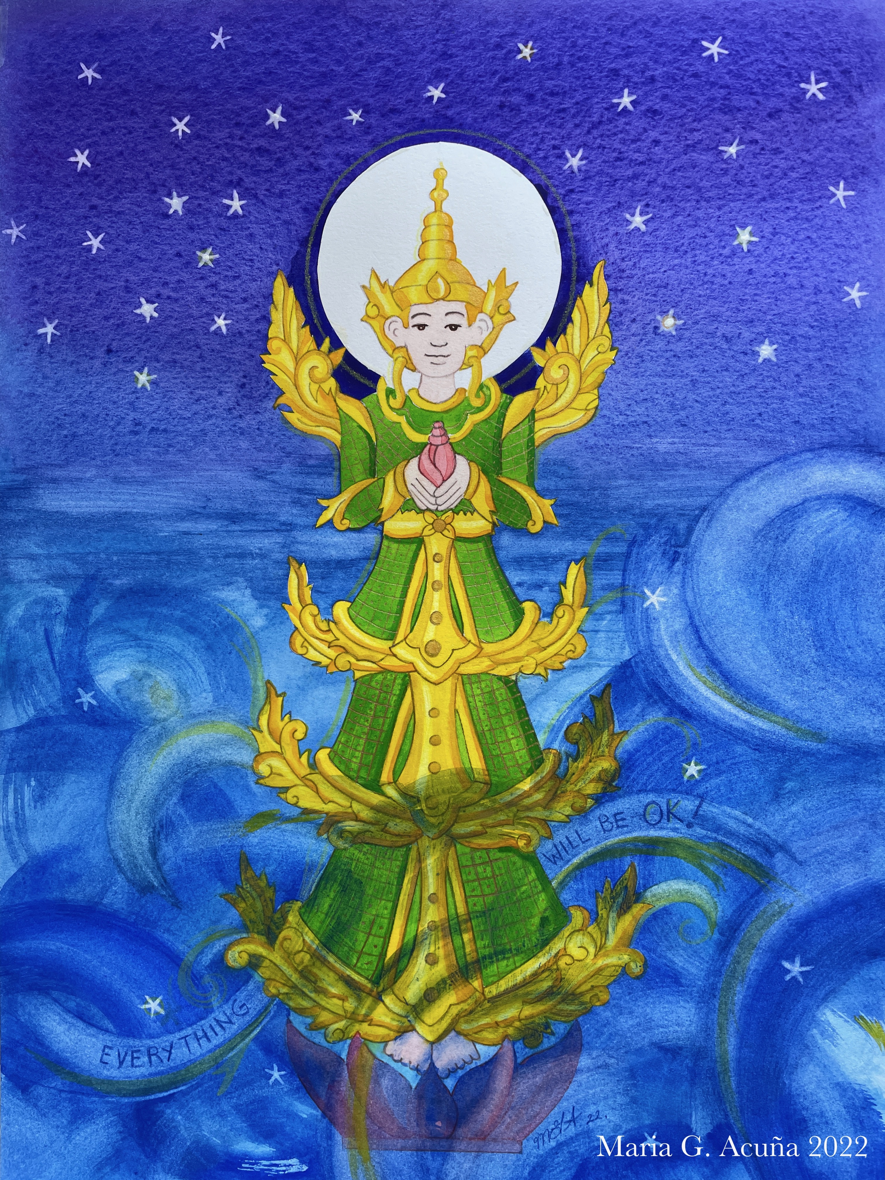 Yes it is better! I was able to salvage some of the lotus flower too. I realized that I had to do it as this angel could not be in a peaceful cloud background with all that is going on in Myanmar. Now the clouds look more like a storm… almost like an ocean where the angel is trying to bring peace. I added Kyal Sin’s shirt phrase “Everything will be OK.” Then the starry calm part at the top is hope, faith in that they will be a peaceful country for all of its people someday.