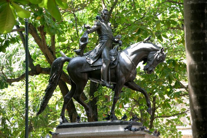 In 1896, the equestrian statue of ‘El Libertador’ Simón Bolívar was installed and it has since been called Plaza de Bolívar. The sculpture was modeled in Munich by the Venezuelan Eloy Palacios, and is made of bronze. Its pedestal is made of granite from Finland, and two replicas of it stand in Maracaibo, Venezuela and Guayaquil, Ecuador.