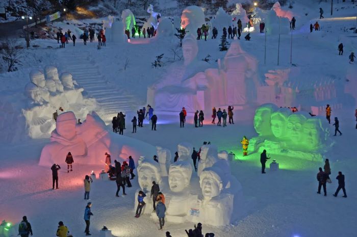 There is a winter festival held within the mountains every year at Gangwon-do. They have ice sculptures, sledding and delicious comforting foods.