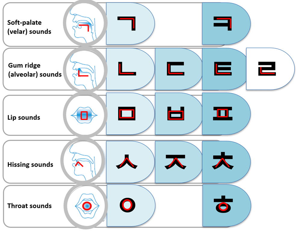 The following comes from a booklet that I got a the Hangul Museum, it explains the language too, but this was the way it was designed originally by King Sejong:
