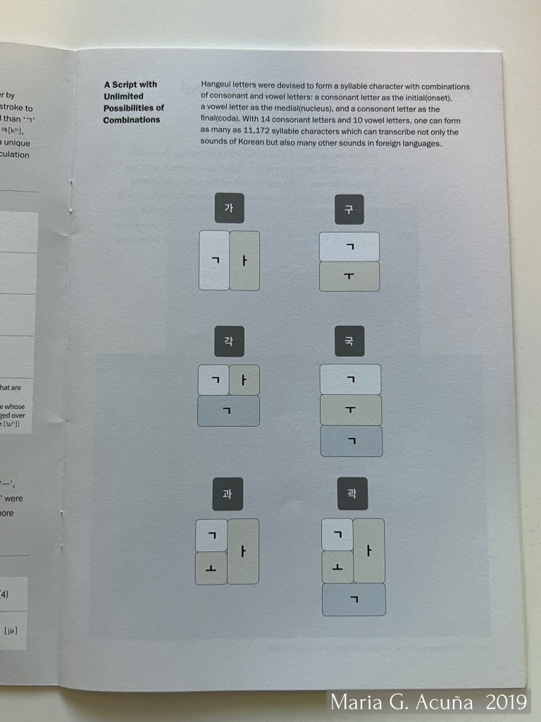 When you walk in the first exhibit you’ll see is about the creation and history of Hangul. Sadly, when I visited it was all in Korean save a few descriptions. They try to help by giving one this booklet (which is where the images above came from.)