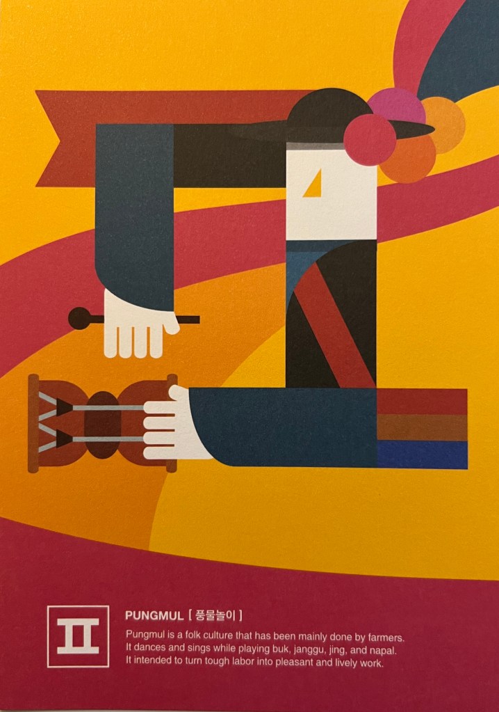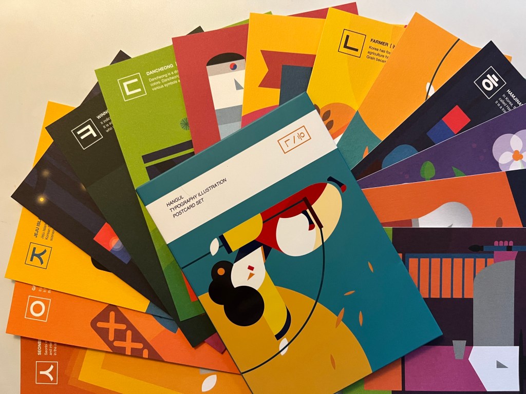 Beautiful postcards with the characters! They portray the letter as a typical Korean culture activities or objects that start with that letter. The illustrations are very geometric and colorful!
