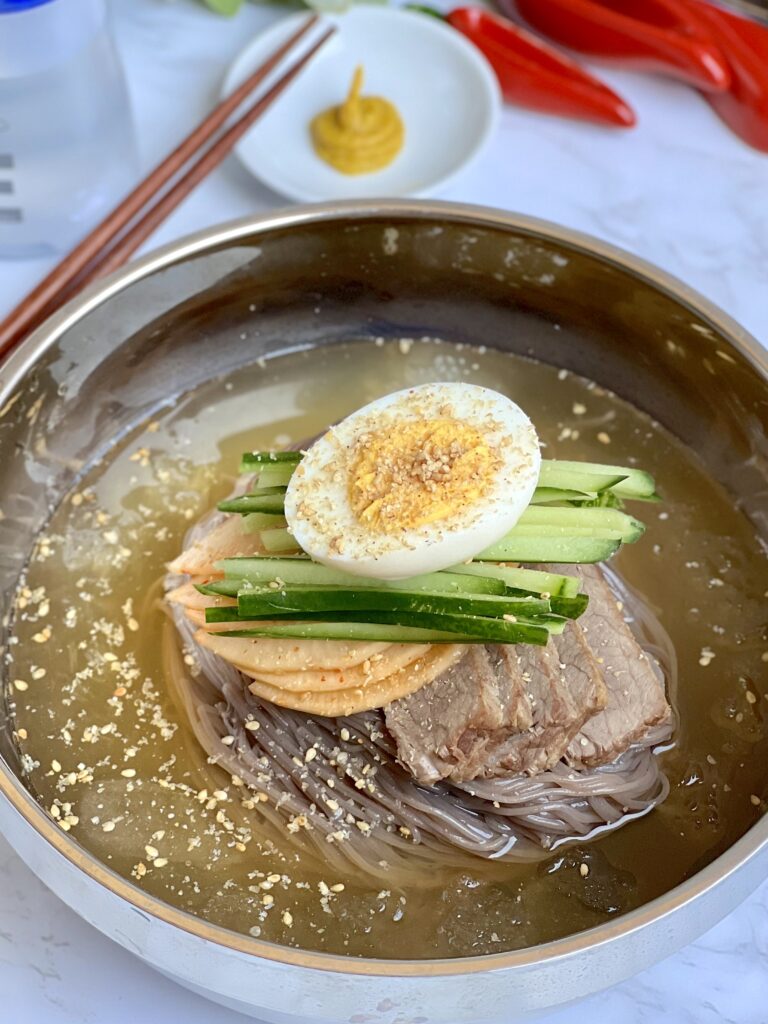 There are two versions of it, Mul Naengmyeon and Bibim Naengmyeon. Mul Naengmyeon is served as a cold noodle soup made from beef, chicken or dongchimi (is a variety of kimchi consisting of Korean radish, napa cabbage, scallions, pickled green chilli, ginger, Korean pear and watery brine) broth.