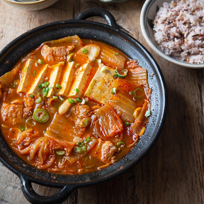 This soup is souper comforting. ^ ^ (Had to do that!) It typically features simmered kimchi, tender pork belly, and soft tofu, all swimming in a deeply satisfying broth. The kimchi provides a tangy, spicy kick, while the pork adds richness and the tofu offers a comforting, soft texture. It tends to be very spicy.